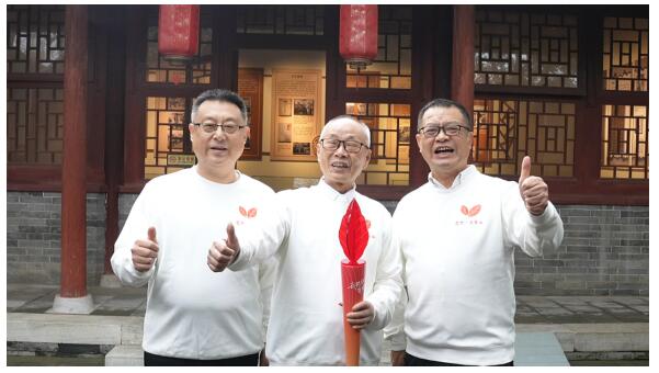 秦鹏(左)、晏鸿国(中)、严树文(右)在晏阳初旧居传递“红叶火炬”